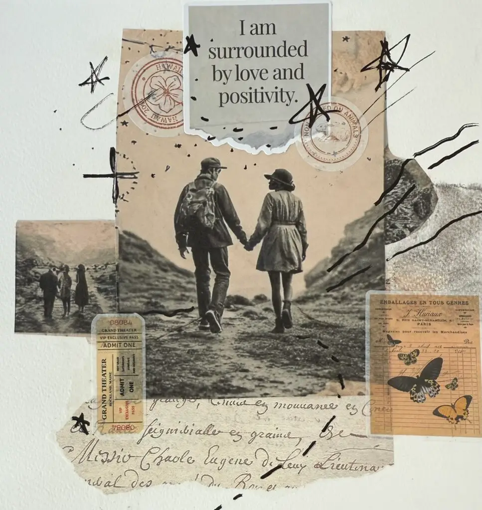 1- Collage layers (paper, fabric, photos).