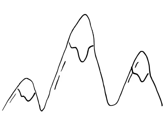 An easy doodle of three mountain peaks with snow tops.