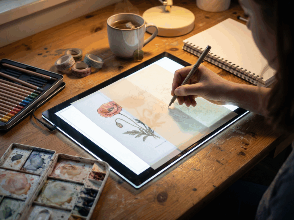 It’s a flat surface that lights up from underneath, allowing you to see through your paper so you can trace cleanly and easily. You simply place your reference image on the lightbox, put your journal page (or watercolor paper) on top, turn on the light and voilà… your lines gently glow through.