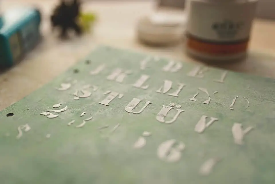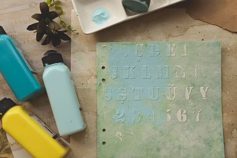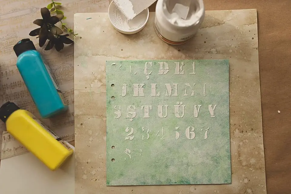 Then I used my stencil to put relief paste onto the cover. I don’t do this carefully or with a plan. Just make a few strokes on your stencil. Whatever you do, the result will be amazing. Oh, this texture! Love it!